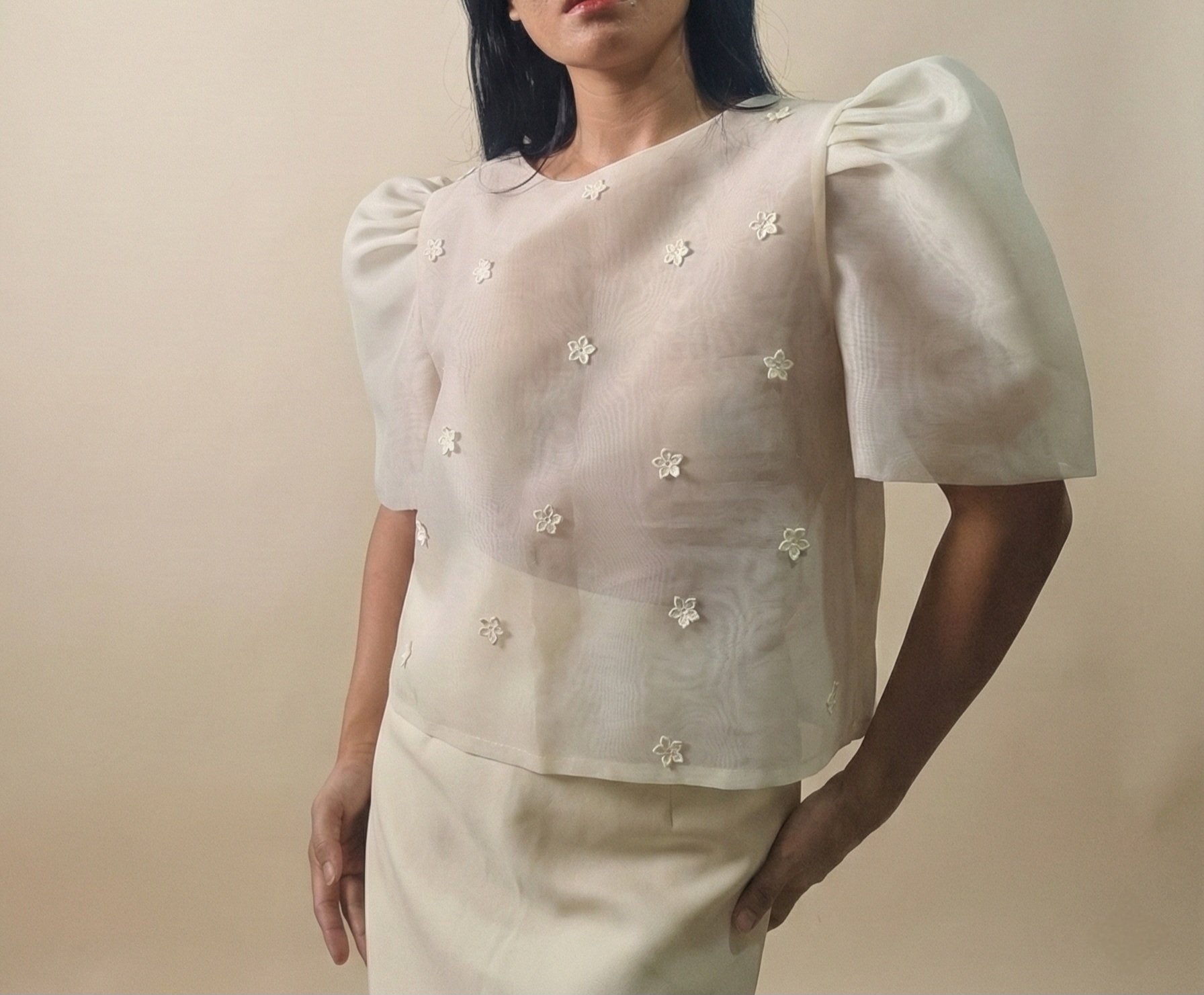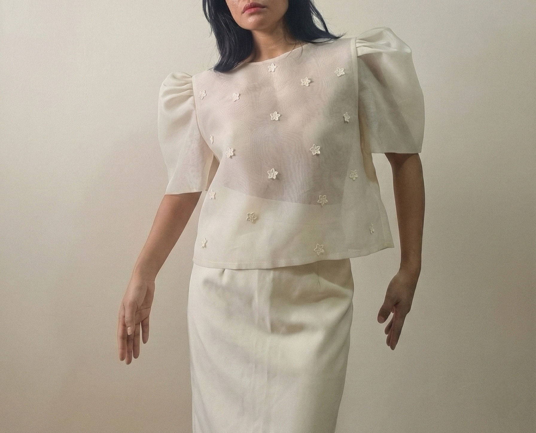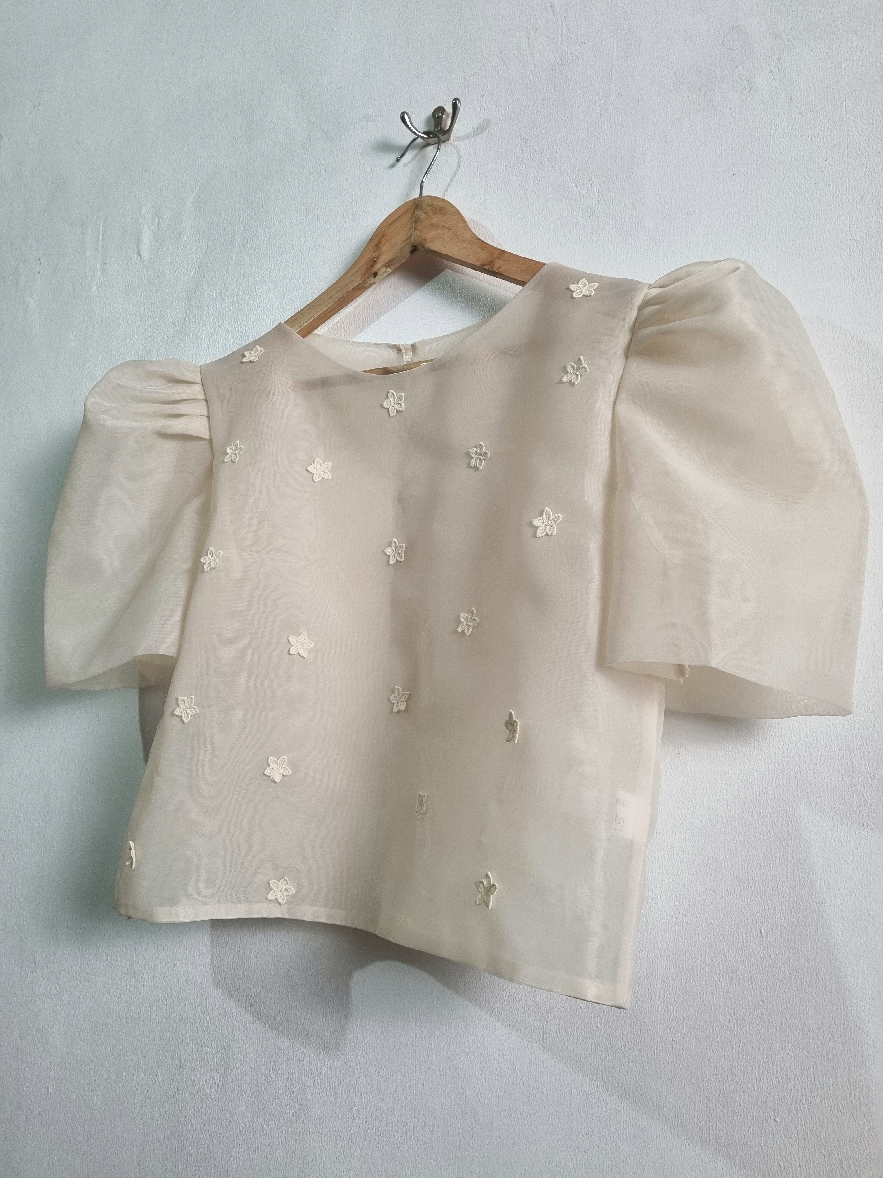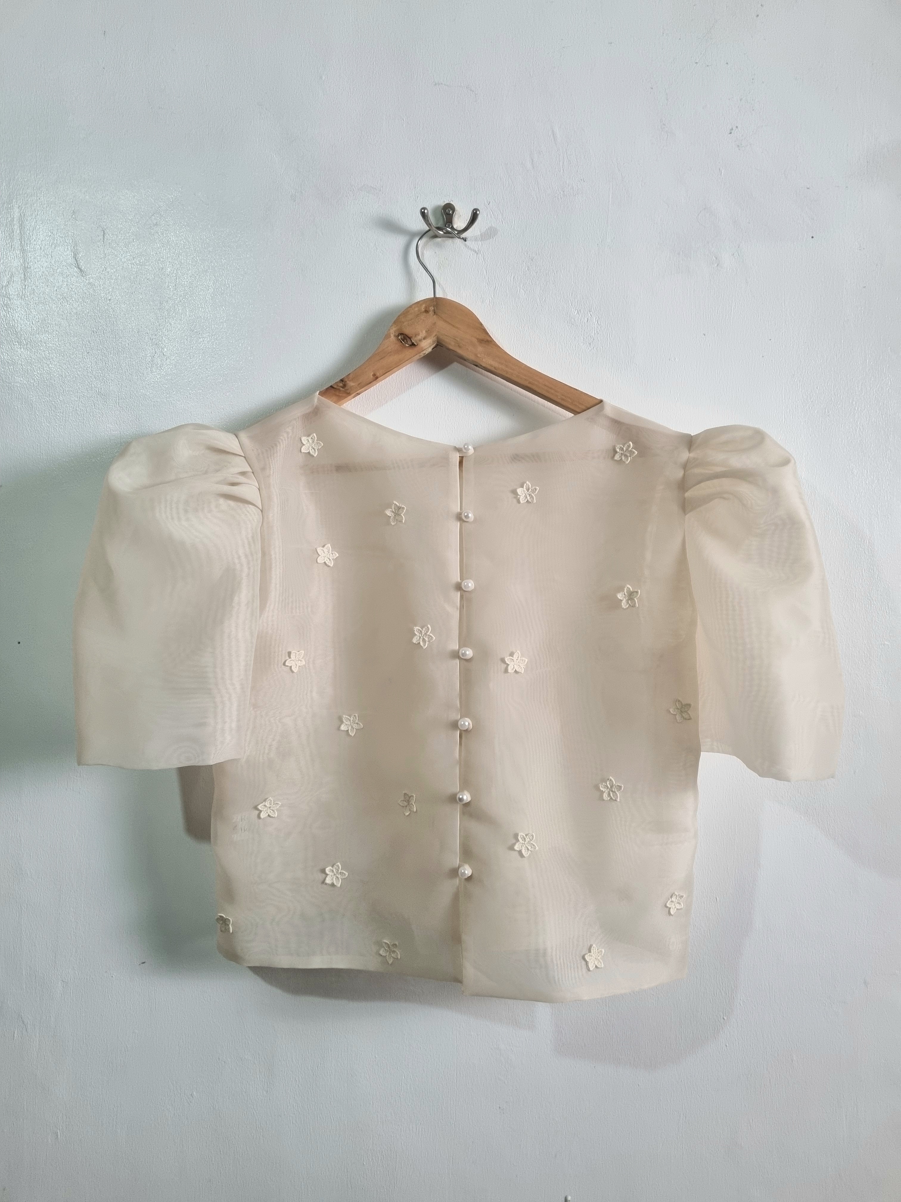 This camisa features delicate floral details on both the front and back. Designed with a button-down back closure for a refined finish.